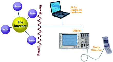 如圖2.1所示,測(cè)試設(shè)備(如Agilent E5515C綜合測(cè)試儀)作為基站仿真器與移動(dòng)終端通過RF線纜連接,測(cè)試設(shè)備通過以太網(wǎng)口與LAN連接,根據(jù)需要,在LAN上還要連接相應(yīng)的PC來監(jiān)控?zé)o線協(xié)議或安裝數(shù)據(jù)應(yīng)用的服務(wù)器。如果需要測(cè)試移動(dòng)終端移動(dòng)IP的性能, 還要連接移動(dòng)IP的服務(wù)器。 這樣移動(dòng)終端就可以與測(cè)試設(shè)備建立數(shù)據(jù)連接,通過上傳或下載數(shù)據(jù)來檢驗(yàn)數(shù)據(jù)吞吐能力,并驗(yàn)證移動(dòng)終端在實(shí)際數(shù)據(jù)應(yīng)用中的基本功能。