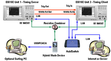 混合模式的測(cè)試方法如圖2.3所示,兩臺(tái)Agilent E5515C 綜合測(cè)試儀分別運(yùn)行CDMA2000系統(tǒng)和1xEV-DO系統(tǒng),當(dāng)嚴(yán)格進(jìn)行同步后就可以模擬實(shí)際的雙系統(tǒng)網(wǎng)絡(luò)。這樣便可以在無干擾的情況下完成混合模式全部功能測(cè)試。具體的測(cè)試項(xiàng)目及方法詳見Qualcomm的測(cè)試規(guī)范80-V6313-1 Rev. A "Test Recommendations for 1xEV-DOHybrid Mode Terminals"。