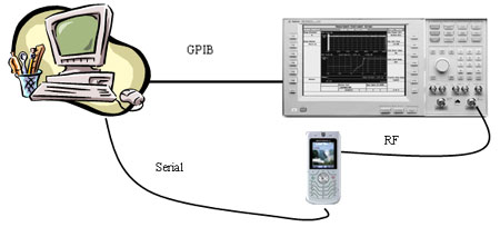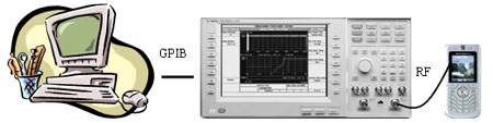 基于TAP(ETAP)的測(cè)試是目前生產(chǎn)線上應(yīng)用比較普遍的測(cè)試,如圖2.4所示,移動(dòng)終端只要RF口與測(cè)試設(shè)備連接,PC通過GPIB對(duì)測(cè)試設(shè)備進(jìn)行遠(yuǎn)程控制,就可以完測(cè)試工作。
