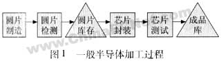 半導(dǎo)體的加工過(guò)程主要分為四步(如圖1所示):圓片的制造和檢測(cè)及芯片的封裝和測(cè)試,其中圓片的制造和檢測(cè)通常被稱為前道工序,主要加工過(guò)程包括化學(xué)清洗、平面光刻、離子注入、金屬沉積/氧化、等離子體/化學(xué)刻蝕等,檢測(cè)完的圓片被送到封裝和測(cè)試廠進(jìn)行后道工序的加工、主要加工過(guò)程包括貼片、環(huán)氧固化、電性能測(cè)試、激光刻飾、焊球粘結(jié)等,前道和后道工序的加工一般在不同的工廠進(jìn)行。