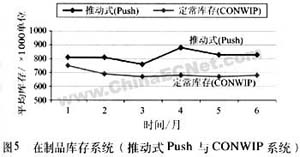 CONWIP系統(tǒng)的引進(jìn)與建立,明顯改善了車間生產(chǎn)周期和庫(kù)存水平,圖4顯示,采用CONWIP系統(tǒng)后生產(chǎn)周期在六個(gè)月內(nèi)降低了20%,庫(kù)存同樣降低了16%,如圖5所示。