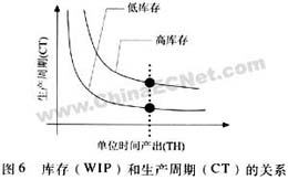 生產(chǎn)周期和庫(kù)存水平控制是一項(xiàng)重要的生產(chǎn)制造指標(biāo),一套好的庫(kù)存水平系統(tǒng)以及低庫(kù)存水平可以帶來(lái)很多好處:首先,確定的標(biāo)準(zhǔn)庫(kù)存水平可以有效限制物料投放,讓訂單暫時(shí)停留在紙上而不是在車間里,這樣可以減少占用寶貴的車間空間,減少質(zhì)量缺陷和返工率進(jìn)而帶來(lái)直接效益,其次,低庫(kù)存水平相應(yīng)地縮短生產(chǎn)周期,如圖5所示,這是符合利特爾法則。