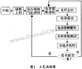 FX-120薄膜電容分選機主要由載料板上料部件、鏈條傳送部件、拔芯部件、電容器整形部件、電容耐壓和容量測試部件、分選下料部件等組成,設備采用了PLC控制、中文觸摸屏顯示界面、凸輪組連動和氣動相結合的結構。其工藝流程圖如圖1。