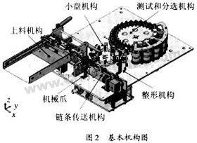 首先將載有電容器的載料板放入上料槽中,上料機構帶動載料板自動進料并通過氣缸吸取、翻轉90°后放入鏈條傳送部件,當光纖傳感器檢測到電容管腳時,拔芯部件動作將電容器從載料板上拔出送入小盤,經(jīng)兩次管腳整形后送入測試分選大盤,在大盤上對電容器進行Co測試,F(xiàn)O飛弧檢測、DCTV直流正反向充電耐壓測試、ΔC容量及D1損耗測試、最后把電容器分選到相應料框中,圖2是基本機構圖。