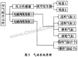 PLC通過控制電磁閥來控制各氣缸動作,負壓的產(chǎn)生等,完成電路系統(tǒng)與氣路系統(tǒng)的聯(lián)接。