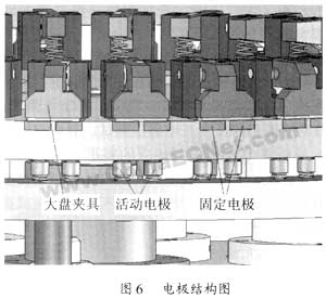 (1)高壓測試上采用活動電極和固定電極相配合的獨特測試結構,銅電極壓緊測試,與傳統(tǒng)的鏈條滑動方式相比較,避免了高壓拉弧的不足,滿足高壓測試的要求,圖6是電極結構圖。